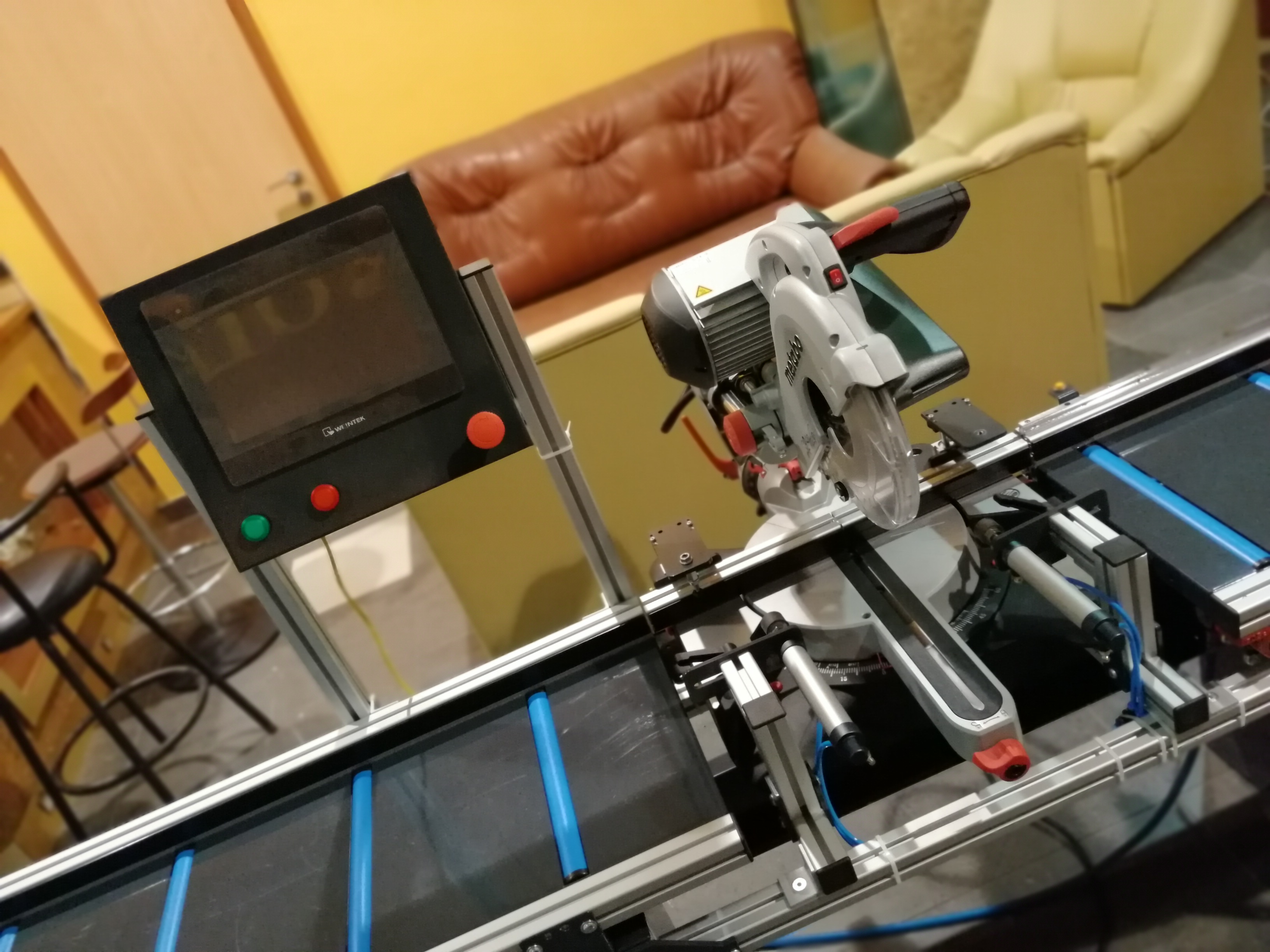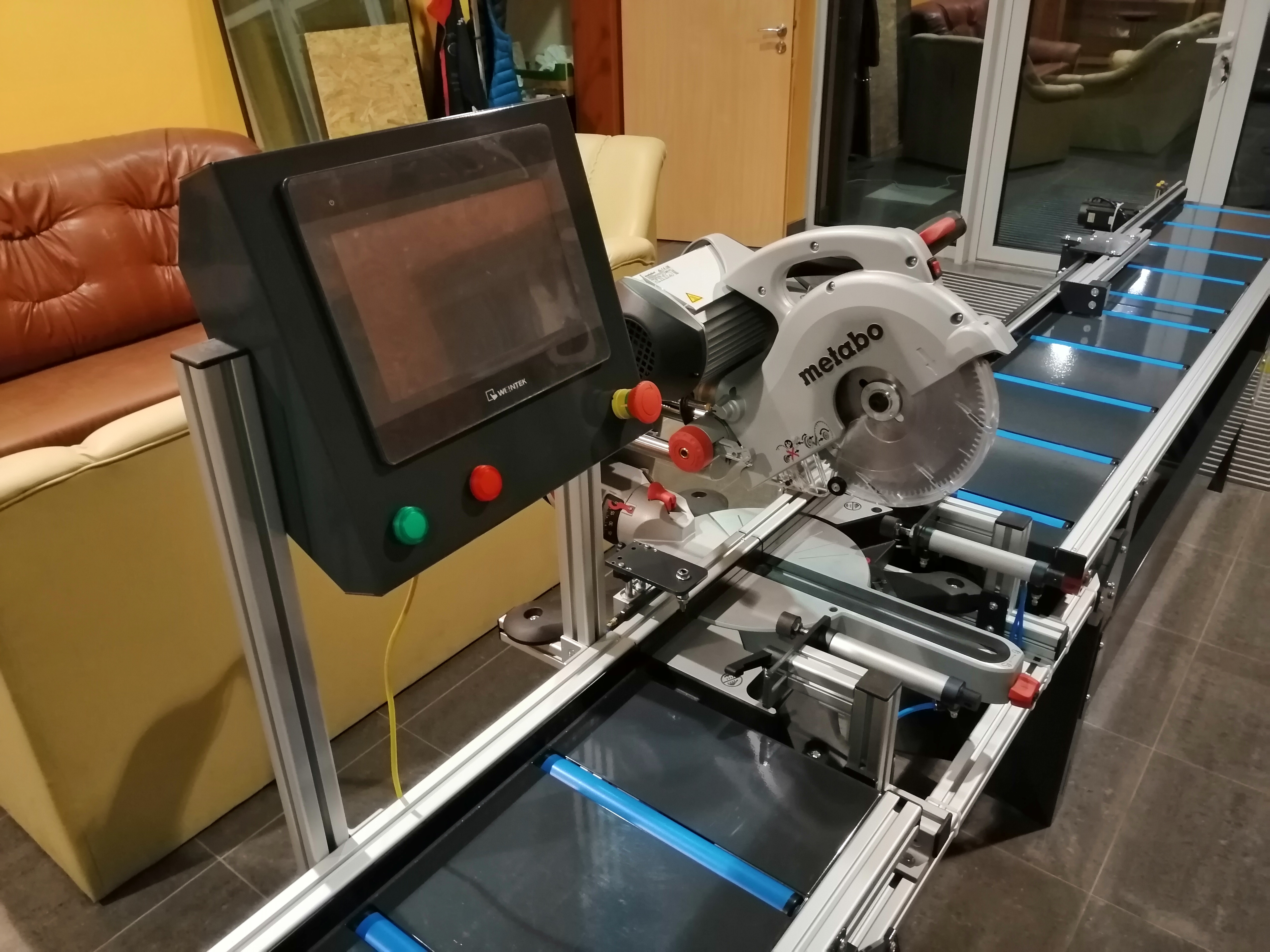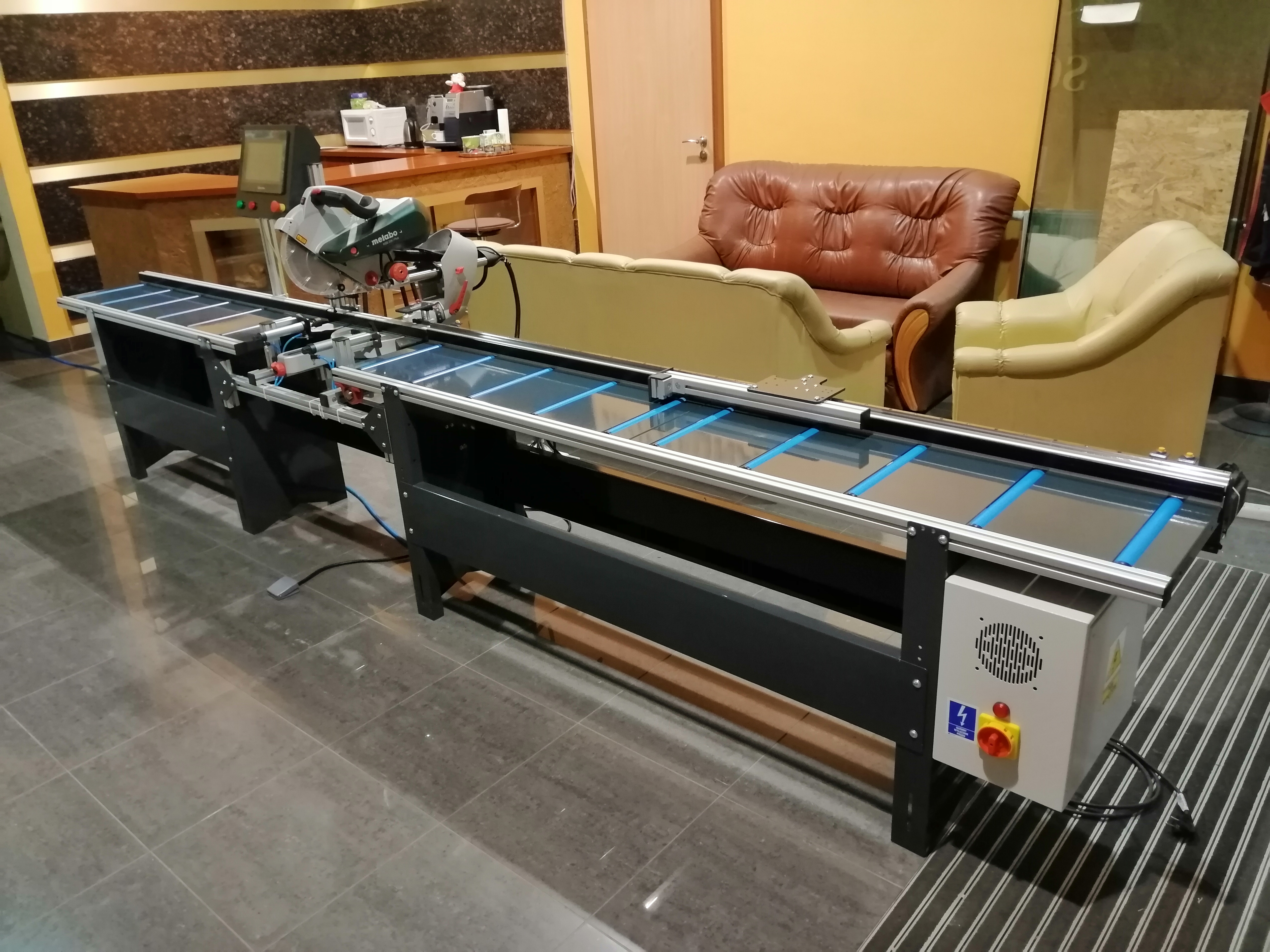 Półautomat do cięcia profili aluminiowych oraz PVC, rolki PVC w blacie, konstrukcja stalowa, skręcana, profile zimnogięte malowane proszkowo, aluminiowa podbudowa piły - możliwość pełnej regulacji i dopasowania do ukośnicy, automatyczne pneumatyczne dociski pionowe i poziome, sterowanie z panelu dotykowego HMI 10" - możliwość zaprogramowania dowolnej funkcjonalności (PLC), czujniki pozycji tarczy do zapewnienia półautomatycznego cyklu cięcia (posuw ręczny), dokładność pozycjonowania zderzaka referencyjnego 0,05 mm. Do precyzyjnych cięć pojedynczych, powtarzalnych (plasterkowanie), z list produkcyjnych (wi-fi / zapisanych na USB) oraz przesłanych z bezprzewodowej tyczki pomiarowej (bluetooth).