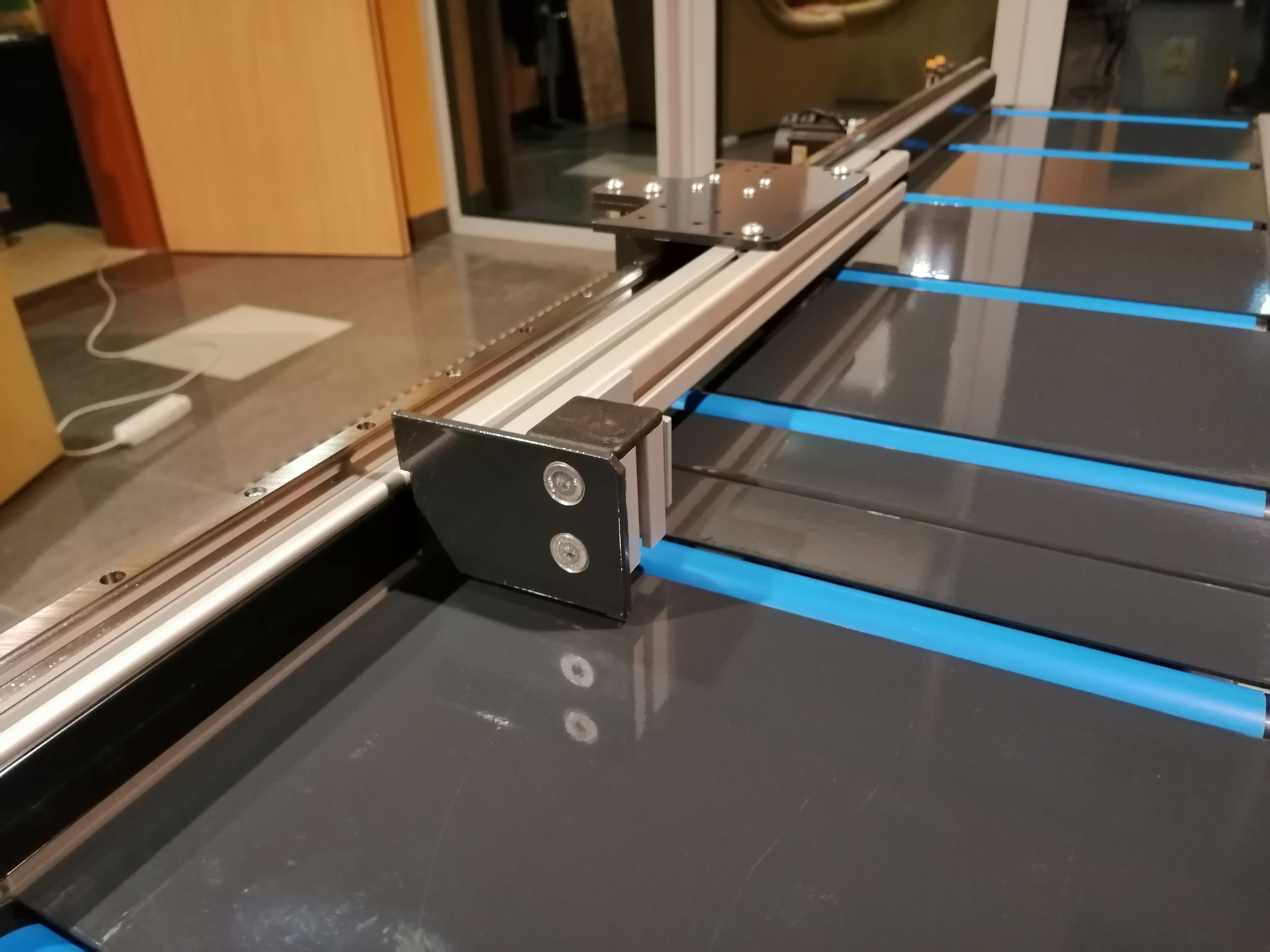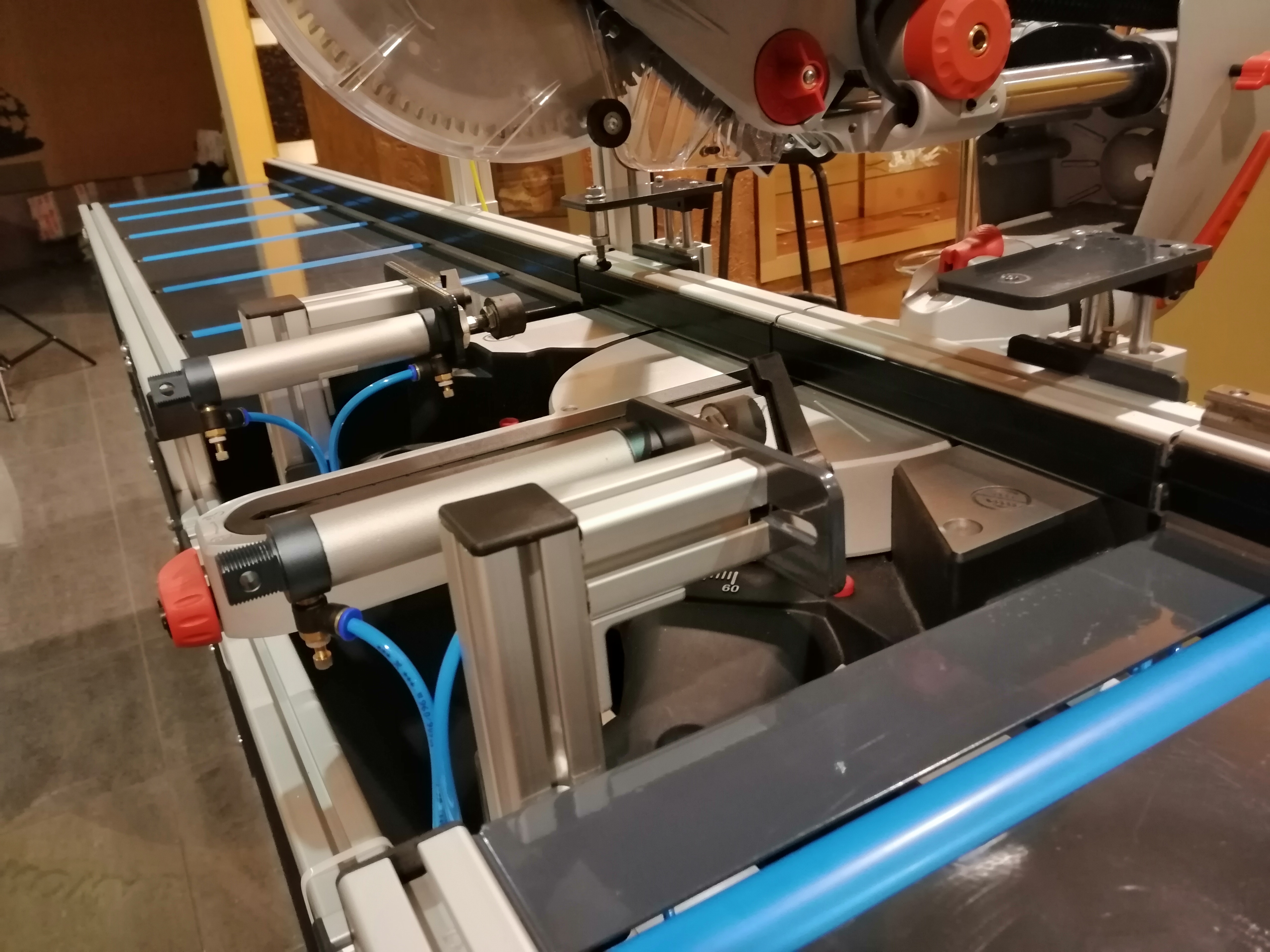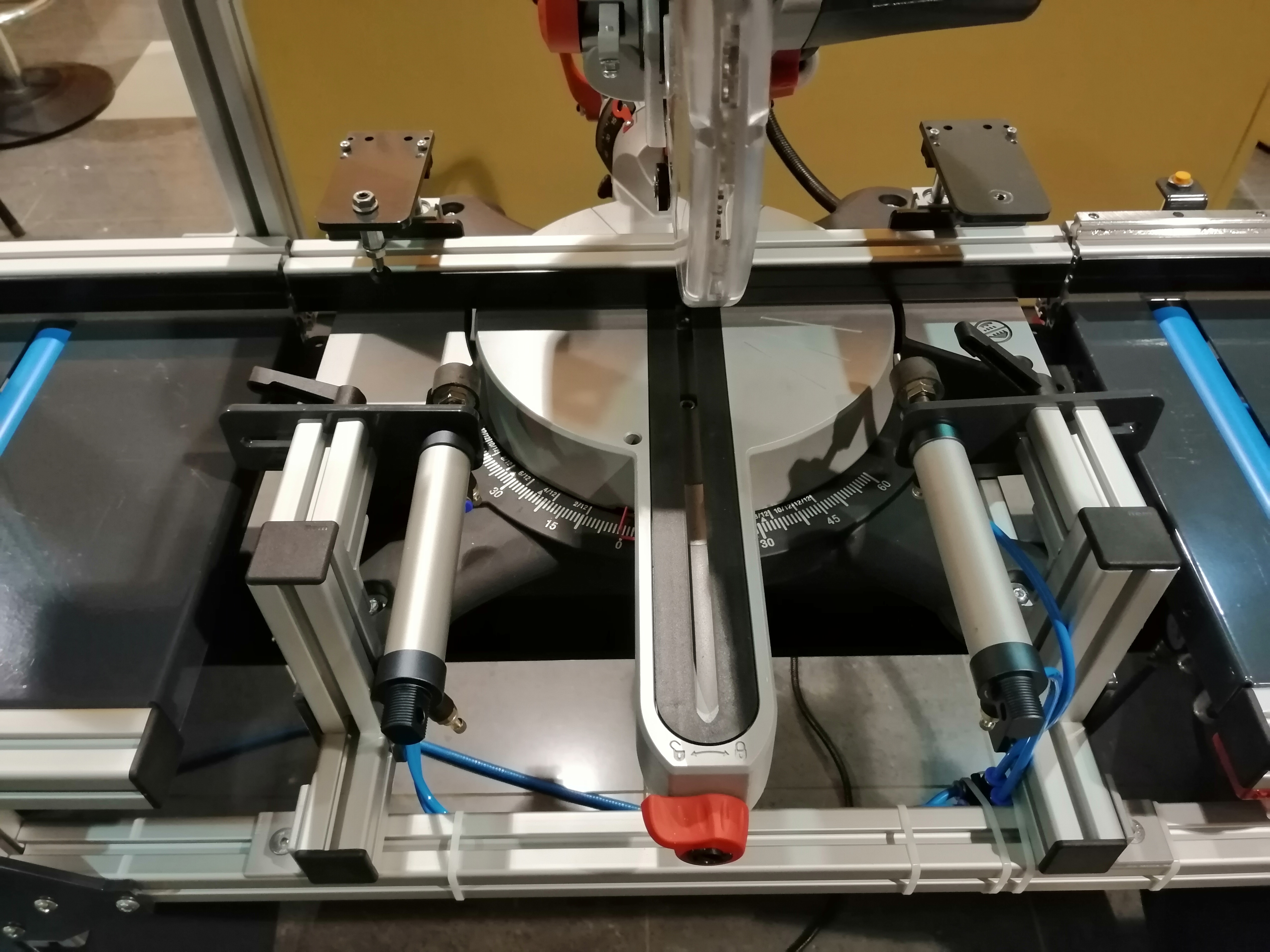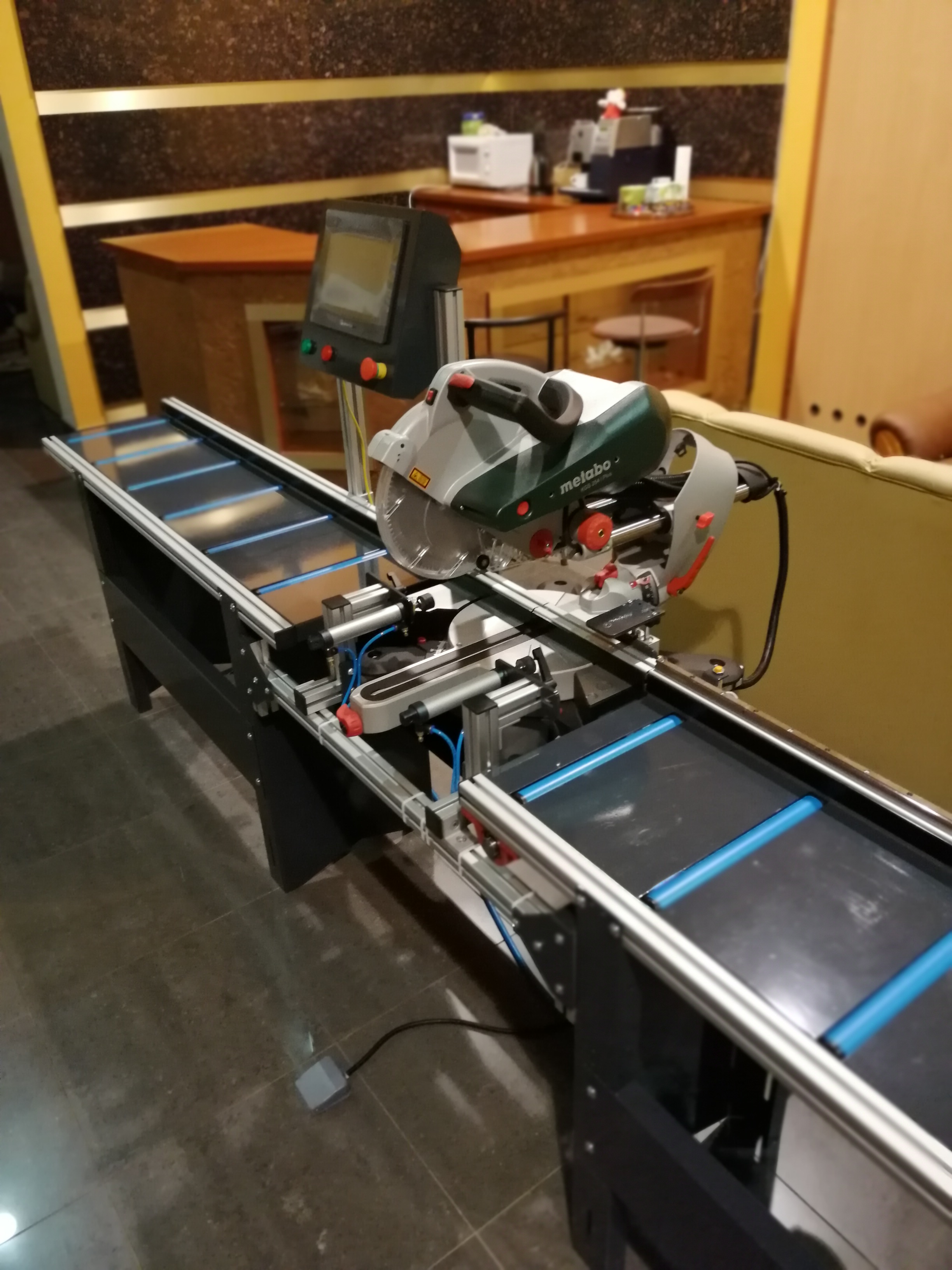 Półautomat do cięcia profili aluminiowych oraz PVC, rolki PVC w blacie, konstrukcja stalowa, skręcana, profile zimnogięte malowane proszkowo, aluminiowa podbudowa piły - możliwość pełnej regulacji i dopasowania do ukośnicy, automatyczne pneumatyczne dociski pionowe i poziome, sterowanie z panelu dotykowego HMI 10" - możliwość zaprogramowania dowolnej funkcjonalności (PLC), czujniki pozycji tarczy do zapewnienia półautomatycznego cyklu cięcia (posuw ręczny), dokładność pozycjonowania zderzaka referencyjnego 0,05 mm. Do precyzyjnych cięć pojedynczych, powtarzalnych (plasterkowanie), z list produkcyjnych (wi-fi / zapisanych na USB) oraz przesłanych z bezprzewodowej tyczki pomiarowej (bluetooth).
